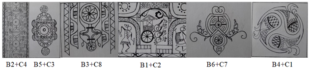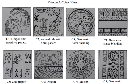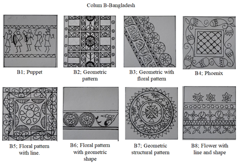 First draft sketch: In every flat sketch creates a specific story with the shape and elements of motif. Gel pen and cartage art paper used to generate individual motif in a 2”/2” box. Colum A depicts the motif construction elements of china where (C1; Dragon skin repetitive pattern, C2; Animal ride with floral pattern, C3; Geometric floral blending, C4; Geometric shape blending, C5; Calligraphy, C6; Dragon, C7; Phoenix, C8; Geometric) every construction has a separate meaning (Figure 18). Column B also interpret isolated shape and meaning of motif construction of Bangladesh where (B1; Puppet, B2; Geometric pattern, B3; Geometric with floral pattern, B4; Phoenix, B5; Floral pattern with line, B6; Floral pattern with geometric shape, B7; Geometric structural pattern, B8; Flower with line and shape) main features covered by sketches (Figure 19).