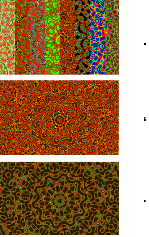 Figure 6 presents the figures constructed by the computer according to one formula, a different size and different color schemes of figure (a) and (b). Figure 7 shows computer drawings constructed using the same formula and different palettes (a), (b) and (c).