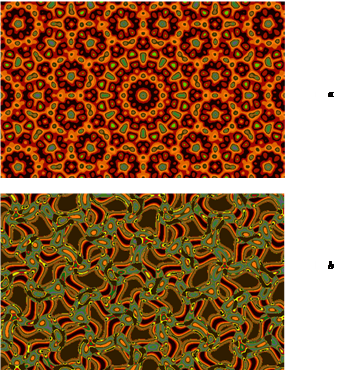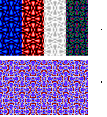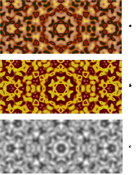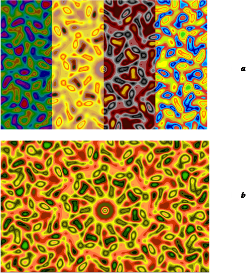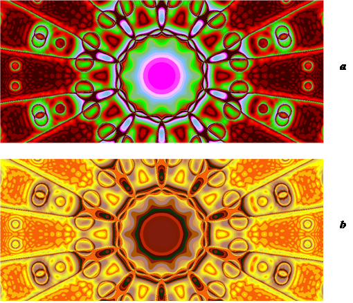 Figure 3 shows an image of a drawing constructed by a computer according to the following formula in four color palettes (a) and a variant of the color scheme for a drawing using this formula (b).