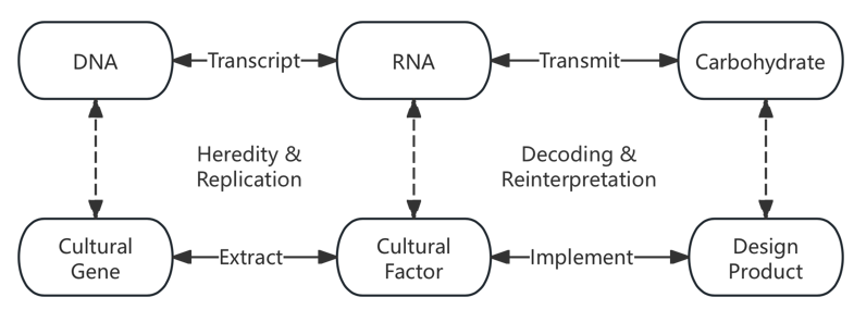 The concept of cultural genes, inspired by biological genes, began as a “Meme” study by British biologist and behavioral ecologist Richard Dawkins in 1976.2 He established an analogy between genetic replication processes in biological inheritance and cultural factor replication mechanisms in transmission, which was a groundbreaking theoretical breakthrough. His student Susan Blackmore, in her monograph “The Meme Machine”, reiterates the conceptual analogy between cultural replication and biological genetic replication, positioning this paradigm as the "genetics" of cultural social transmission.3 Compared with the international research on cultural genes, Chinese study on the cultural genes has a much more comprehensive approach and broader scope, discussing both communication and cultural structure.4 Scholar Liu Changlin pioneered the study of cultural genes by integrating this framework with interpretations of traditional Chinese culture in 1988.5 Ten years later, Shang Leling advanced the "Three-Layered Theory of Cultural Genes" ,‘The first layer isthe structural gene of systematic knowledge, the second layer is the regulatory gene that can recognize the regularity of knowledge and the operational gene that can turn knowledge into usefulness’.6 To recapitulate, cultural genes function akin to DNA, where the cultural factors carrying essential hereditary information undergo transcription ("heredity and replication"), then through designed translation ("decoding and reinterpretation") manifest as novel cultural vectors, thereby actualizing cultural transmission (Figure 1).7,8 During cultural transmission, targeted modifications can be implemented to cultural genes, analogous to genetic iterative processes, which plays a pivotal role in maintaining their vitality and enabling adaptation to evolving societal environments.9