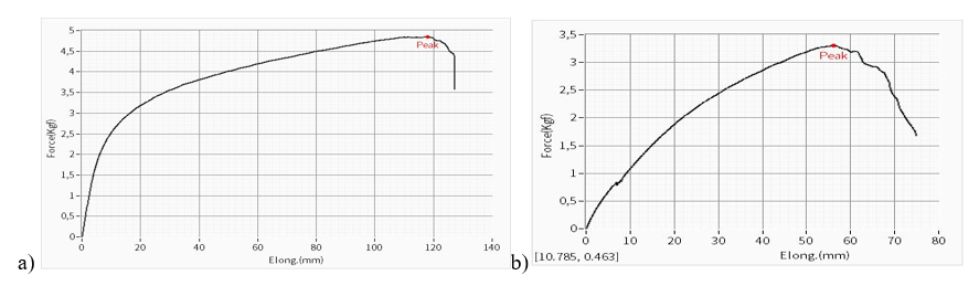 In Figure 8 below, the non-woven fabric obtained from ungraded and non-standard cocoons has a strength of 5.022 ± 2 kgf, a width of 3.840 ± 2 kgf, which is 30.8% stronger than the width of the core, and the tensile strength indicators are 1.705 ± 1 MPa and 1.282 ± 1 MPa, respectively, which is 33.0% higher than the width of the core. Also, the elongation percentage is 124.425 ± 3%, a width of 120.133 ± 3%, which is 1% higher than the width of the core. It stretches more when exposed to sunlight. The strength and durability of the fabric are reduced by 30-33%, while the elasticity is reduced by only 8.6%. This indicates the stability of silk and its balanced properties in terms of deformations.