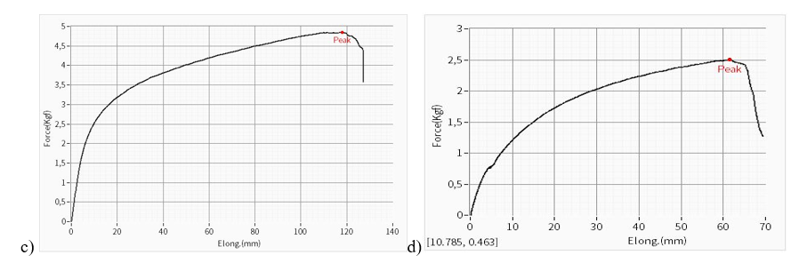 Figure 4 c) The average tensile strength and elongation at break of the experimental results obtained for the width of the H2 nonwoven fabric, d) the width of the nonwoven fabric.