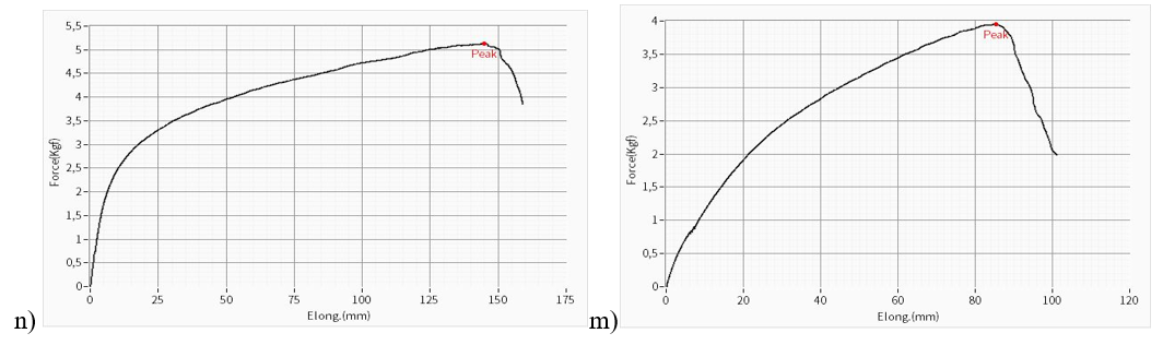 Figure 8 n) The average breaking strength and elongation at break of the experimental results obtained for the width of the nonwoven fabric obtained from low-grade and non-standard cocoons, m).