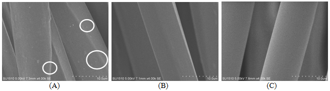The SEM images (Figure 2) show the surface structure of PET-DTY with and without AC, as well as PET spun yarn. Figure 2A presents that the AC distributes uniformly in the fibres compared to Figure 2B. Along the fibre axis, the edges are found special-shaped in Figure 2A & Figure 2B, which is different from the circular section of spun yarn in Figure 2C.