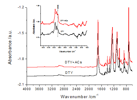 No apparent differences are found in the chemical structure for PET-DTY with and without ACs from FTIR results in Figure 3. The chemical structure is not affected by surface particles AC of DTY fiber.