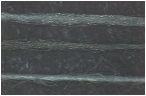 The appearance photos of PET-DTY with and without ACs, and spun yarn were examined in Figure 4. The colour of PET-DTY with AC (Figure 4, middle) is darker than that of DTY without AC (Figure 4, upper), and the hairs cannot be observed on both of them. At the bottom of Figure 4, the hairs cover the surface of spun yarn.