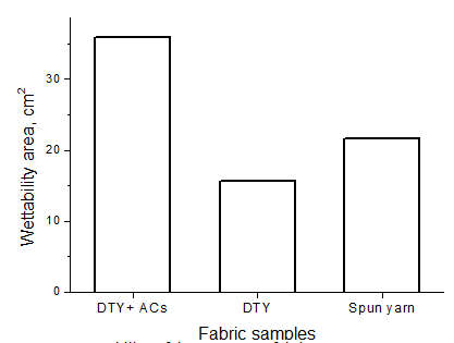 The DTY sample with AC is proved to have better wettability than that of DTY and spun yarn from Figure 5. The microporous AC has high specific surface area, which benefits the water transport.