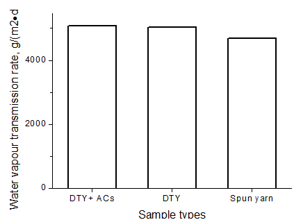 From Figure 6, there is a little incrementation but not significant differences in the water vapour transmission rate of mattress fabrics of PET-DTY with AC and without AC compared with that of spun yarn. The reason may be that the surface hairs and short fibre length of spun yarn prevent the moisture from penetrating.