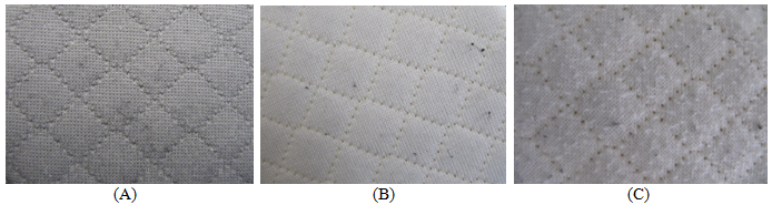 Figure 7 shows photos of mattress fabric composed of PET-DTY with AC (Figure 7A), DTY (Figure 7B) and spun yarn (Figure 7C) after pilling. Obviously, from Figure 7, PET-DTY with AC shows no apparent difference with DTY, while the dense fuzzing and pilling covers the fabric of spun yarn.