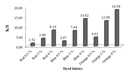 Colour strength values of reactive dyed fabrics are presented in Figure 1. For all colours, K/S values increased due to dyestuff concentrations were increased, as expected. Orange coloured fabrics gave higher K/S at all dyestuff concentrations than the others. Fabrics dyed with blue colour had higher K/S than the red ones. The relationship between K/S and colours was also confirmed by the tinctorial strengths of dyes as shown in Figure 2.