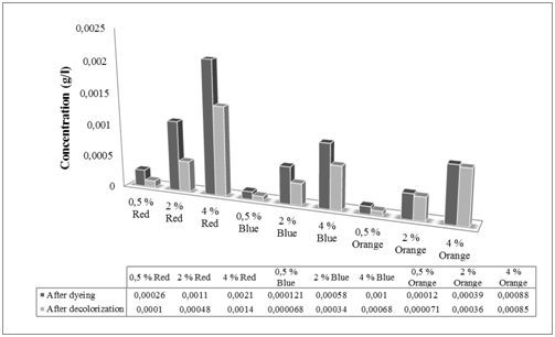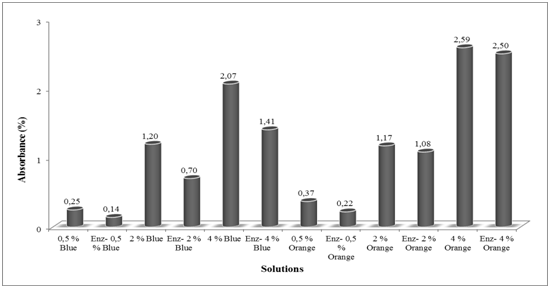 Absorbance values of orange and blue colours at all dyestuff concentrations after dyeing and enzymatic decolorization are shown in Figure 4. UV–VIS absorbance values were observed at 600-620nm for blue, 400-440nm for orange. Approximately same absorbance values for orange and blue colours after enzymatic decolorization at 0.5% dyestuff concentrations were taken, but the difference at 2-4% concentrations increased and orange gave higher absorbance values. Red colour gave approximately same absorbance values at 0.5 and 2% dyestuff concentrations with blue colour, while the value at 4% concentration was higher than the blue, even though its tinctorial strength was the lowest. This could be explained as the amount of dyestuff bound to fiber was less, and therefore dyestuff remaining in the solution was greater amount.