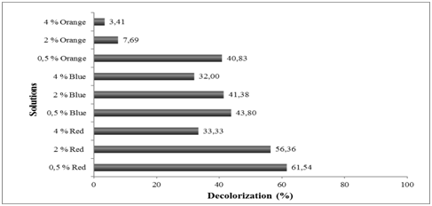 Percentages of absorbance reductions are shown in Figure 6. These values showed that red colour was the most affected by the enzyme and absorbance values decreased about 56-61 % at 2% and 0.5% dyestuff concentrations, respectively. For blue colour, these reductions were about 41-43 % for same concentrations. For 0.5 % dye concentration of orange, the effect of the enzyme on decolorization was about 40 %, while the enzyme had less colour removal effect as dyestuff concentration was increased because of its tinctorial strength. As the concentration of dyestuffs used in dyeing was increased, amount of decolorized dyestuff decreased. Therefore, less decolorization percentage was observed at higher dyestuff concentrations.