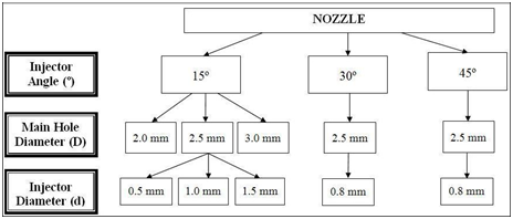 Nozzles used in the study are different from each other regarding with the nozzle structural parameters such as injector angle, main hole and injector diameters (Figure 3). In the analysis, one of the structural parameters is changed when the others keep constant.