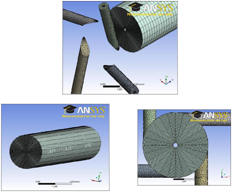 The quality of a CFD solution is highly dependent on the quality of the grid. During the grid generation, sharp-pointed angles are occurred due to the intersections of the injectors and twisting chamber. Hence, it is difficult to obtain a regular mesh in the entire geometry. On the other hand, injectors are one of the most important nozzle structural parameters concerning with the fluid flow and therefore it was given importance to generate a regular grid structure in this section. We followed a strategy applying the automatic mesh option to the section between the injectors and yarn entering zone while using a structured mesh to the section of nozzle exit (Figure 5).