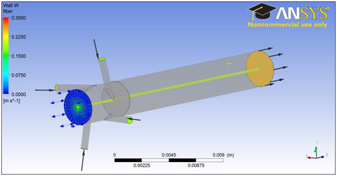 It is assumed that the cross-sectional area of the yarn is about 1/100th to that of the main hole of the nozzle and the yarn occupies a small area in the nozzle. Hence, the flow inside the nozzle affects the yarn, but not vice versa Patnaik et al.6 Rengasamy et al.8 Therefore, the yarn was not modeled in the numerical analyses concerning with Jetring or air-jet spinning systems. Present work includes the area from where the yarn is passing and studies the flow field around the yarn even if the effect of the yarn is accepted as insignificant (Figure 4). We believe that the yarn is one of the most important components of these spinning systems. Additionally, it was given a speed which is equal to production speed of spinning machine to the yarn (approximately 0.2 m/s).