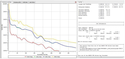 In a CFD solution process, the conservative equations are solved iteratively for each cell. Sometimes hundreds or even thousands of iterations are required to converge on a final solution and thus the residuals may decrease by several orders of magnitude. In the work, iteration number was taken five as a minimum value and 300 as a maximum. Depending on the converging condition of the solution, iteration was performed over 300. Sensitivity of the solution was set at 10-5. In addition, one point is defined to check the solution converging and the quantities such as pressure, velocity etc. were monitored. As it is seen in Figure 9, when the sensitivity of mass, momentum and energy equations shown by different colours reaches 10×10-6, iteration loop is almost equal to 300 and the deviations in the solution decreases and also the defined point is settled down to the constant values (Figure 10).