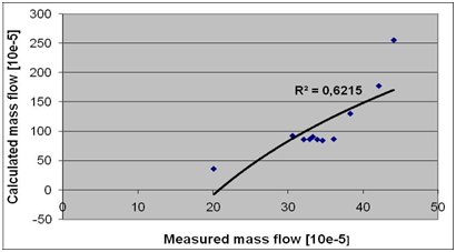 To insure the solutions, mass flow values of the pressurized air sent into the nozzle were measured by electronic mass flow meter and compared with the calculated values by the numerical analysis. It was determined that the calculated and measured values are almost compatible. However, the values are not completely the same as we desired. There are differences in the values and the differences are reaching up to 2-3 times. As it is seen in Figure 11, the regression coefficient representing the relation between the computed and measured data is 62.15%. Although this coefficient is satisfying, it is not as much as we desire. It is believed that the differences in the data may result from the nozzle configuration associated with the air density value.