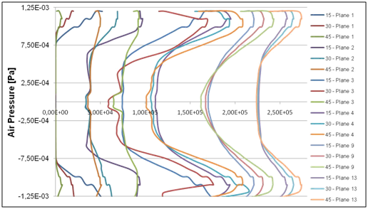 In Figure 14, it is given the air pressure distribution of the airflow along the nozzle length for all injector angles. Plane 1 and plane 2 represents the nozzle inlet while plane 3 and plane 4 shows the injector region of the nozzle. Lastly, plane 9 and plane 13 indicates the nozzle outlet. In the profiles, it is easy to see the suction effect at the nozzle inlet and outlet, and also higher air pressure at the nozzle walls.
