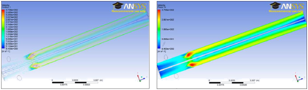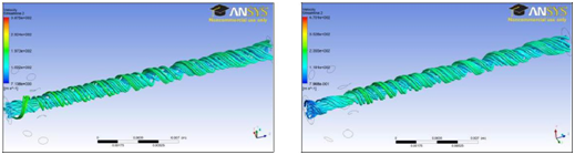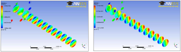 In all analysed nozzles, a boundary layer generates as a thin layer having lower air pressure and velocity values at the nozzle walls and also on to the yarn. The airflow strikes to the nozzle at the boundary layer and its pressure and velocity reduces and the fluid flow is being a laminar flow (Figure 20). Therefore, air velocity on the yarn is considerably lower and it is almost equal to the production speed of the Jetring spinning machine. However, the airflows coming from the nozzle injectors and main hole swirl with higher air velocities.