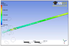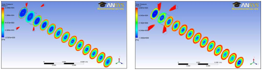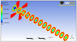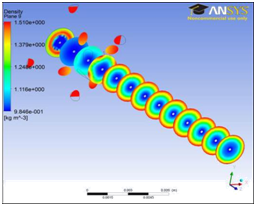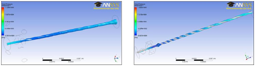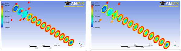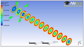 According to the CFX analysis, Mach number is 0.6-0.64 at the injectors, 0.19-0.55 at the nozzle inlet while 0.18-0.63 at the nozzle outlet. Although Mach number shows a large distribution at the nozzle inlet and outlet, the values concentrate on 0.46 at the nozzle inlet and 0.3 at the outlet. According to the Mach number values, the flow velocity is lower than the speed of sound and the speed can be called as subsonic. Regarding with the numerical analysis of the airflow in the nozzles, it was stated that Mach number is large and changing with the range of 0.6-0.9 for 2.5×105 Pa Guo et al.9-11