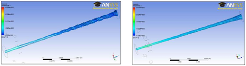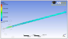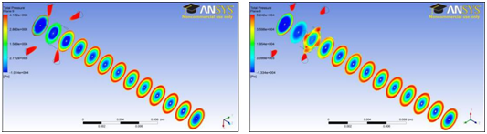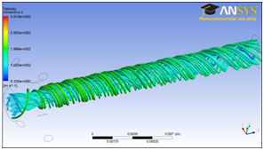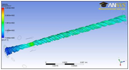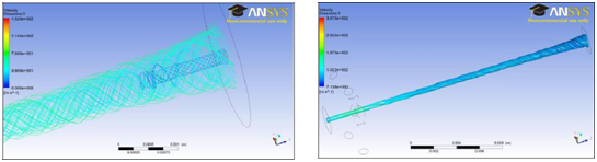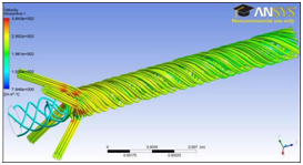 Helical streamlines shown in Figure 16 and the animations indicate that the amount of air leaving from the nozzle increases as the injector angle increases. The pressurized air follows a swirling path about the nozzle walls and density of the swirling steps increase at the 15˚. In 45˚, the air moves inside the nozzle and hence follows a shorter way and the air goes through the nozzle outlet. Therefore, the more air leaves from the nozzle in 45˚ injector angle at the same duration. Once the injector angle decreases, the airflow moves with larger steps in the nozzle and the density of the helical streamlines lessens at the downstream of the nozzle.
