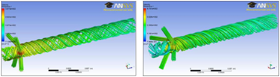 When the airflow on the yarn is analysed, it was found that the air goes forward without swirling from nozzle inlet to the injectors (Figure 21). Suction effect at the nozzle inlet leads to this airflow case. And then the airflow starts to swirl beyond the injectors and moves to the nozzle outlet. Particularly, in 2.0 mm main hole and the nozzles having 1.0 mm and larger injector diameters, the air starts to rotate at the nozzle inlet. On the other hand, as it is seen in Figure 22b, the airflow shows a regular distribution on the yarn and covers the yarn completely. We expected that this airflow character may improve the yarn quality. However, in larger injector diameters and also lower main whole diameters, the airflow rotates a few turns around the yarn and helical streamlines distributes less on the yarn surface (Figure 21d).