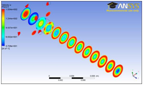 As it was also mentioned in the literature, the analyses of ANSYS Fluid Flow (CFX) indicate that pressurized air swirls along the nozzle and an air vortex is occurred in the nozzle. In fact, there are two types of swirling airflow having different rotating directions in upstream and downstream of the nozzle.