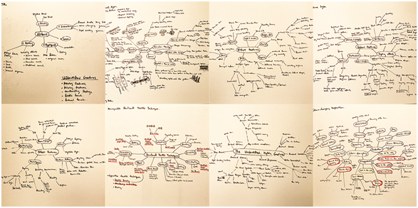 Brainstorming was conducted to perform as a semi-systematic possibility seeking tool. Potential discovering and creativity generating are the major foci aiming to maximize the multidimensional imagination on the design possibility. It also functioned to generate and accumulate positive emotion and fascination on the research area. Two divergent threads were initiated in exploring material possibilities and potential Shibori techniques in forms of mind-mapping and rapid ideation (Figure 1). The process was associated with intensive rough sketching and simple hands-on mock-up. Three mind-mapping techniques were adopted in accordance to different natures of idea generation. The subject matters, for instances different types of Shibori and smart materials, were firstly expanded by lateral relating. Different themes, for examples significant property, independent variable, possible production stage and available resources, were assigned and linked to the same core. Secondly, the prominent products of the lateral relating were expanded with question words and related considerations for rapid ideation. With a number of thematically formed and question-led mind-maps, secondary and tertiary mind-maps were then drawn by intersecting the idea networks constructed from the previous generations, followed by detailed analyses and initial proposals (Figure 2).