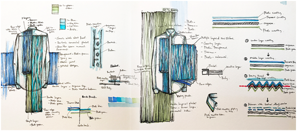 In the early development stage, the initial feasibility trials on hybrid sensitivity integration at different sequential textile processes, including pre-, mid- and post-fabric-formation, have been conducted and positively proven.10 In order to put the trial results in actual practice, a prototype was artfully created with enhanced design sophistication. Aiming to suggest a new direction of consideration in the interactive fashion and textile design discipline and unfold a platform for discussion, the prototype is designed with the theoretical perspectives of the newly sprang critical design practice narrated by Mazé & Redström11 Malpass.1