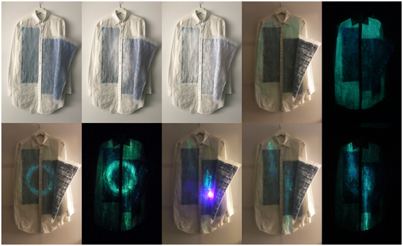 After considering the situational suitability, a selected initial proposal was refined by integrating the results attained in the multi-sensitive textile development process. Supported by the previous stages, the research prototyping phase was smoothly conducted with enhanced design sophistication. A dual-sensitive panel (Figure 4) was recreated with additional hand embroidery and texture enhanced layer and further applied to the critical design practice resulting in the research prototype, Textural Dynamics (Figure 5). Functioning as an in-stage implementation, the attire was cautiously designed and artfully created to give a physical form to the established idea in a balanced, pragmatic and holistic practice. Figure 6 shows the different reactive behaviors and hence the diverse appearances that the realized prototype affords. Equipped with the right exhibition setting and tools, for example, ultraviolet laser pointer, the audience is entitled a high level of user autonomy. Since the audience is able to manipulate the appearance of the attire and temporarily compose a customized signifier, a higher level of interactivity, thus, an enhanced human-artefact engagement and the corresponding user-experience are anticipated. Nevertheless, the hypothesis is to be proven by further empirical study.