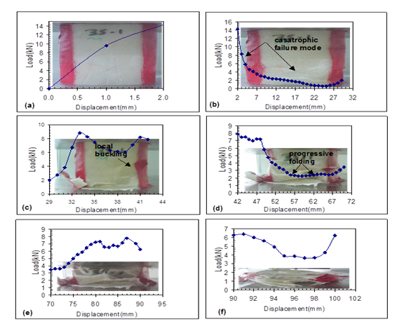 Figure 1, shows a typical load-displacement curves and deformation history for a hexagonal composite tube with an aspect ratio (L/t=70 and β=35˚) subjected to the quasi-static compressive load. Linearity is evident during the pre-crushing stage as shown in Figure 1a & 1b.In this stage the tube resistance reaches first and highest peak Pi=PH=14.3 kN at a displacement of 4 mm (0.05h) followed by a gradual decrease till it reaches the lowest load value PL=0.6 kN at displacement 24 mm (0.32h). A rapid rise of the load carrying capacity was observed and reached its second peak value of 8.8 kN at a displacement 33 mm (0.44h). The splaying failure mode, then, occurred as result of local buckling as shown in Figure 1c. After that, the progressive folding is dominating the post -crushing stage as clearly illustrated in Figures 1d-1f.
