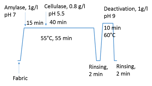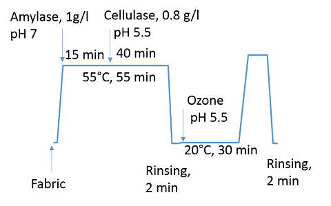 All the washing trials were carried out in industrial sampling size ozone wash-extractor equipment (Tonello). For the ozone trials, ozone was generated from oxygen and fed to the washing drum through the ozone dissolving system where ozone gas is dissolved into water. The system has an ozone destroyer and ozone sensors for detecting ozone leakages to avoid health and environmental risks. A combined desizing and bio-stoning was carried out in the same bath with the liquor ratio of 8:1 (dry garments to water), (Figure 2). The desizing was done with alpha-amylase enzyme (1g/l) for 15 minutes at 55˚C in neutral pH. Thereafter, acetic acid was added to adjust pH to 5.5 prior to the addition of cellulase enzyme (0.8g/l) for the bio-stoning process. The enzyme treatment was carried out at 55˚C for 40 minutes. After rinsing (2 minutes with ambient temperature water, 20˚C), the enzymes were deactivated by adding alkaline detergent (1g/l). pH was raised over 9 and kept there for 10 minutes at 60˚C to ensure the deactivation. During the deactivation step, the liquor ratio was 6:1. The combined desizing and bio-stoning was ended with cold rinsing followed by tumble drying at 80˚C.