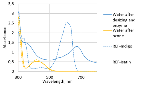 The spectra of washing baths after the desizing and enzyme step and after the ozone step were recorded from the wavelength range of 300–900nm with a Shimadzu UV-Vis spectrophotometer UV-160A. The water samples were filtrated before the analysis. For the reference indigo (CAS 482-89-3, Acros Organics, the USA) and isatin (CAS 91-56-5, Merck KGaA, Germany) were dissolved in DMSO.