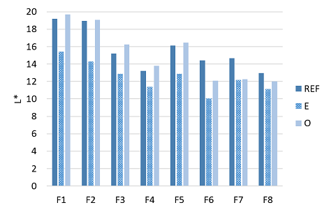 Figure 5 Lightness, L*, of the untreated (RFE), desized and enzyme washed (E) and desized, enzyme washed and ozone (O) treated denim samples.