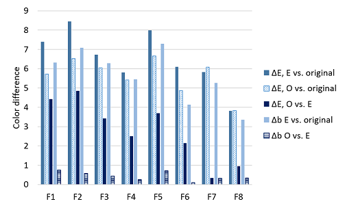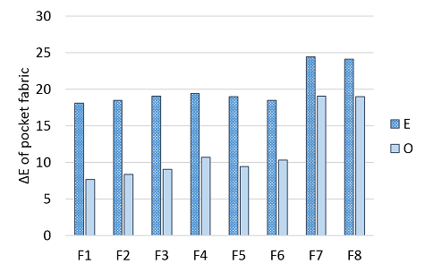 Figure 7 Backstaining of the pocket fabrics i.e. color change (ΔE) of the pocket fabrics after enzyme, E, and ozone, O.