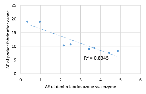 Figure 8 Relationship between backstaining of the pocket fabric after ozone wash (ΔE of pocket fabric after ozone) to the response of the denim fabrics to ozone (ΔE of fabrics ozone vs. enzyme).