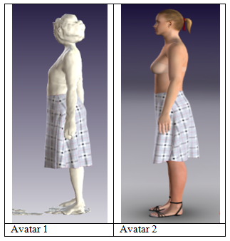 Table 2 displays the ratings for the A-line Skirt with plaid fabric. Plaid was used to help detect any fitting issues, such as an uneven weave or hem. Higher ratings for appearance, smoothness and fit were assessed for Avatar 2. However, Avatar 2 presents a more aesthetic image. Also there is an apparent difference on the side view of the A-line skirt simulation. The image of Avatar 1 shows less fabric plaid and Avatar 2 shows a more even fabric plaid weave on the side view (Figure 2). Overall, the front view of Avatar 1 presents a rounded and curved appearance, while Avatar 2 shows a flatter appearance in the front view.