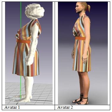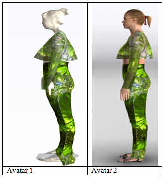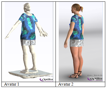 Evaluations for the T-shirt are presented in Table 3. Higher ratings in appearance, smoothness and fit were assessed for Avatar 2. However, it was noted that the smooth wrinkle free appearance of Avatar 2 did not accurately reflect the drape of the fabric, whereas Avatar 1 did reflect more realistic creases in the fabric. Due to experimental apparel design, fitting issues – appear less smooth on Avatar 1 than Avatar 2. This less smooth appearance suggests the need for pattern adjustment (Figure 3).