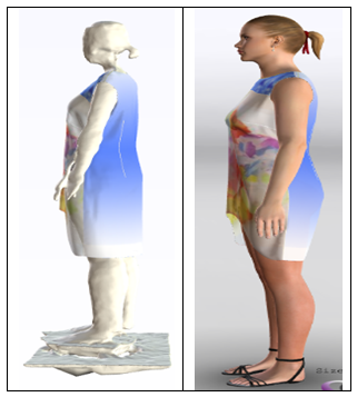 In the first research question, does using a 3D body scanning system such as Kinect to scan oneself and create an avatar versus using a customized programmed avatar in the design process influence a better visualization of fit? It is not 100 percent accurate. But according to the professionals’ evaluation, a highly acceptable rate was evident. Referring to the second research question, do different virtual avatars have different fitting results? The results suggest fit is similar in most areas, such as the upper torso. But despite the overall similarity in fit, differences appeared in the drape of the fabric and certain curved areas, such as in the lower torso and at the waist area.