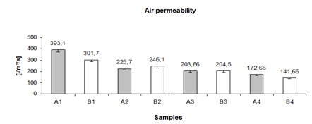 Air permeability results are strictly related to the degree of porosity in the samples which is also related to nanoparticles deposition onto the fabrics. More specifically it can be said that when lower porosity is obtained, that indicates a successful pre-treatment with highest deposition of nanoparticles on the surface of the textile.