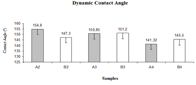 The contact angle measurements, Figure 3, obtained for cotton only samples A3, a decline in the degree of hydrophobicity is noted after pre-treatment due to the increase in the hydrophobic effect even if temporary. A3 is 6% more hydrophobic than A4, but the end result was nanoparticle deposition for both. In S2 we verify an increase 2,7% from B2 to B3, as expected due to the already higher degree of hydrophobicity of PES. Mixed CO/PES, B2 samples, contact angle increases after S1, but diminishes after S2. This demonstrates the ineffectiveness of S2 to nanoparticle deposition, because of the appearance of a lower contact angle relative to pre-treatment, showing that nanoparticles do not fixate in the substrate. In this case S1 is more effective for both samples. S1, allows a higher quantity of nanoparticles to be deposited in less functionalization time. Hydrophobicity tests do not reveal much differences between samples subjected to S1.