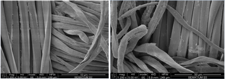 We observed that after alkaline pre-treatment a reduction in the quantity of pores and interstices was obtained. Consequently, there has been an increase in surface area of cellulose fibers, specifically CO for both samples, due to modification of its geometry, which explains the decrease of air permeability.