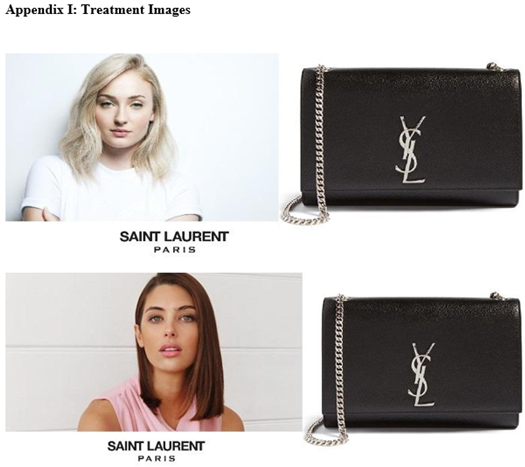 A pre-test was conducted to examine which brands, influencers and celebrities would serve as appropriate stimuli for the experiment. A convenience sample of 10 female students at the University of Otago was recruited for the pre-test, and they were presented with pictures of three influencer endorsers, three celebrity endorsers and three luxury handbags. Three handbag brands were selected for the pre-test (Louis Vuitton; Gucci; Yves St Laurent) all of whom target young consumers, and all have used social media campaigns. Similar, entry price-point bags were selected for inclusion. The influencers and celebrities used in the pre-test were selected for age (under 25 years, to ensure social relevance to the participants) and high recognisability among the target population. Further, all endorsers had previously worked with luxury brands. In the pre-test, participants were asked to indicate how well they identified with the endorsers and how recognisable they perceived endorsers to be. The requirement for recognisability was established as an experimental control to minimise the effects of unfamiliarity as a confounding variable. For the main experiment, the celebrity and the influencer with the highest fit score was selected (International actress Sophie Turner for the celebrity and New Zealand social media influencer Jamie Ridge). The Yves Saint Laurent ‘Kate’ bag was selected as the most desirable handbag to the pre-test group.