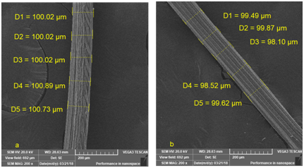 The unmodified viscose fiber and the PAMAM modified viscose fiber were observed by scanning electron microscope, and the results are shown in Figure 2. It can be seen that the modified viscose fiber has a uniform thickness; It can also be found that the self-made fiber has a straight groove, which is the same as ordinary viscose fiber,23 indicating the addition of PAMAM to viscose fiber has little effect on the surface morphology of viscose fiber. The radius of the viscose fiber and the PAMAM modified viscose fiber are very similar, indicating that PAMAM has no significant influence on the thickness of the viscose fiber.