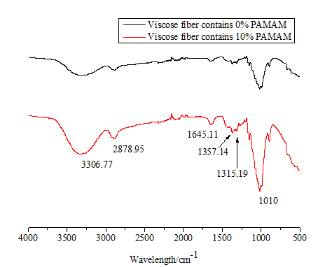 Infrared spectral scanning of viscose fiber and modified viscose fiber by KBr tableting. It can be seen from Figure 3 that the modified viscose fiber has a larger hydroxyl absorption peak at 3306.77cm-1, which is mainly due to the fact that the end group of the PAMAM is an amine group, and the stretching vibration of N-H overlaps with the stretching vibration peak of the hydroxyl group. The peaks were found to be large at 1645.11cm-1, 1357.14cm-1 and 1315.19cm-1, indicating that the amides I and II in the PAMAM overlap with the six-membered C-C absorption peaks in the viscose fibers. The -CH2- vibration absorption peak appearing at 2878.95cm-1 and the stretching vibration absorption peak of tertiary amine appearing at 1010cm-1 have become larger, indicating that the PAMAM enters the inside of the fiber.