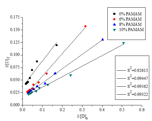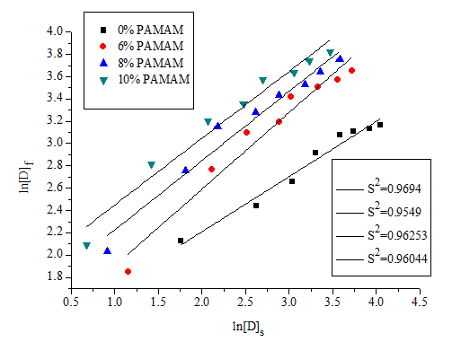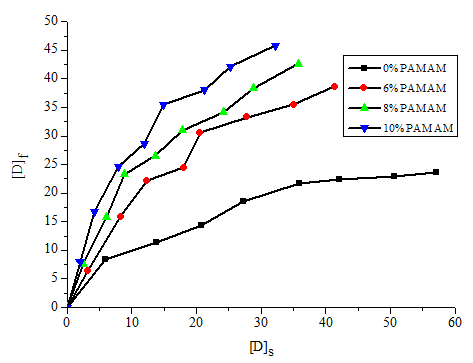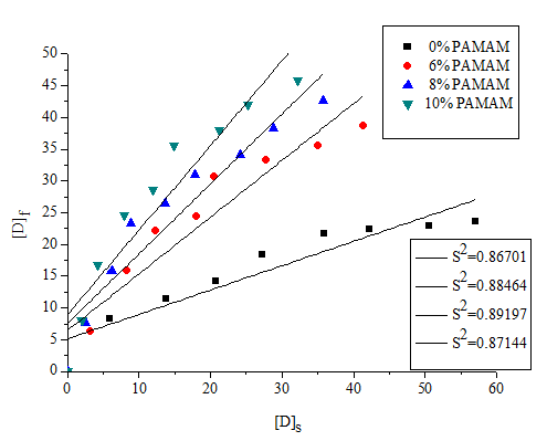 In order to more accurately determine the adsorption isotherm type, each adsorption isotherm data is linearly fitted, [D]f and [D]s are in a straight line relationship, and are in a straight line relationship, and are in a straight line relationship. The result is shown in Figures 5−7.