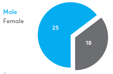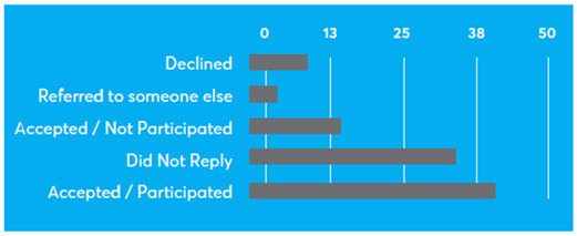 The research project gathered the opinions and experiences of experts with direct contact and use of the technology; the selection of the sample was purposive rather than random. 100 Experts from four different backgrounds of the fashion industry were selected to participate in this survey contacting personal interviews. As Figure 1 shows, 43 “relatively unstructured” personal interviews were carried out; some of them in typing due to lack of time on their behalf or the time difference between countries. 34 didn't respond at all, although they have been contacted with a coming-up e-mail twice. In the Figures 2-5 participants are categorized in some demographics; Gender, Age Group, Country of work and Occupation.