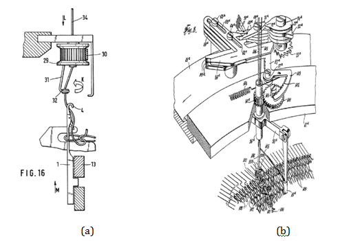 Figure 1 Schematic of loop thread laying mechanism for Single-Jersey machines according to patent (a) and modified Double-Jersey machine with non-rotation knitting cylinder but rotating creel according to patent (b).