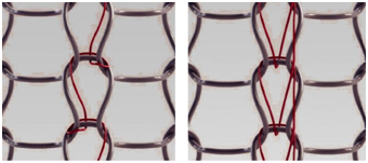 Figure 2 Schematic of tow embedding forms of an additive functional thread in stitch wale direction as loop (left) or pillar stitch (right) using the LTLS.