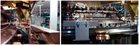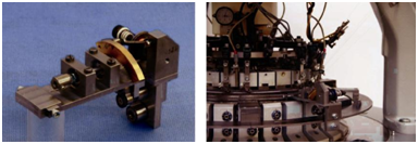 Figure 9 Detailed view of non-rotating cam track carrier and LTLS mounted on drive ring and its bearing (l.); total view of two LTLS rotating with synchronized revolution in front of the knitting cylinder of interlock circular knitting machine (r.).